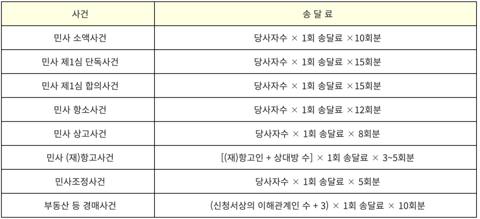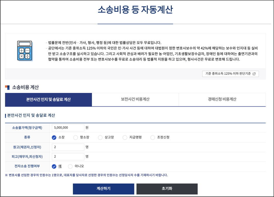대한법률구조공단 홈페이지에서 ‘소송비용 등 자동계산’ 서비스를 제공하고 있습니다.