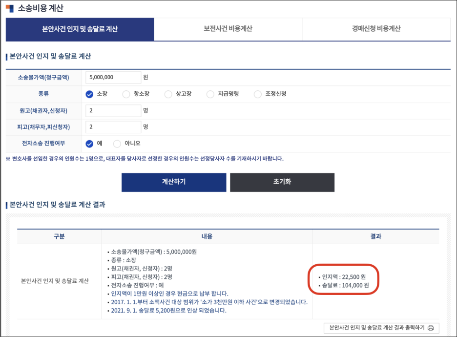 일반인도 이 사이트에서 몇가지 정보(소가, 원고 및 피고 수, 전자소송 여부)만 입력하면 바로 계산하여 소송비용을 확인 할 수 있습니다.