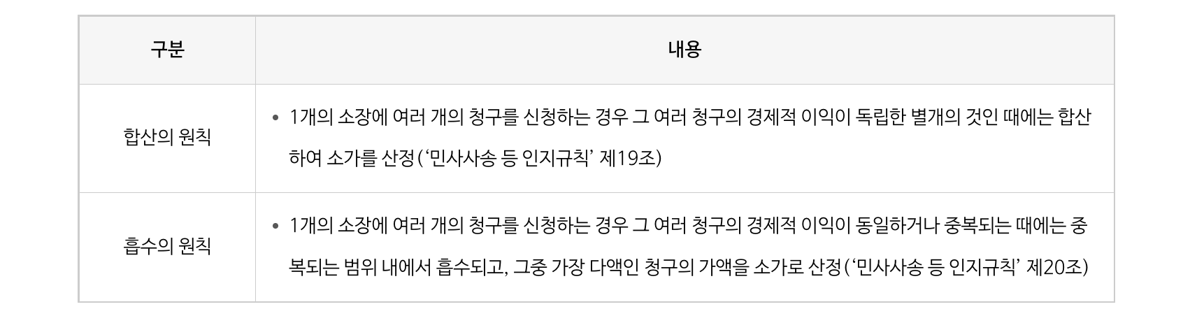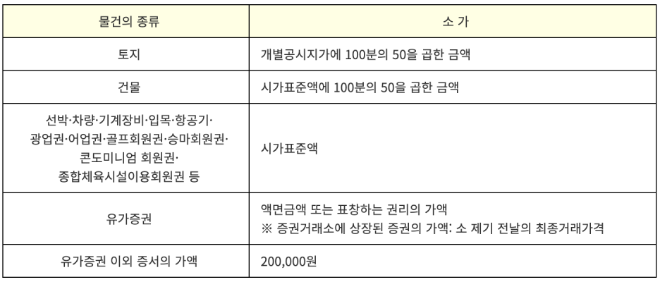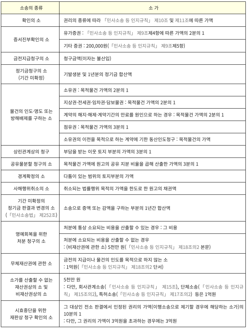※ 위에 규정되지 않은 물건 또는 권리의 가액은 소송을 제기할 당시의 시가(시가를 알기 어려운 경우 그 물건 또는 권리의 취득가격 또는 유사한 물건 또는 권리의 시가)로 합니다(‘민사사송 등 인지규칙’ 제11조).