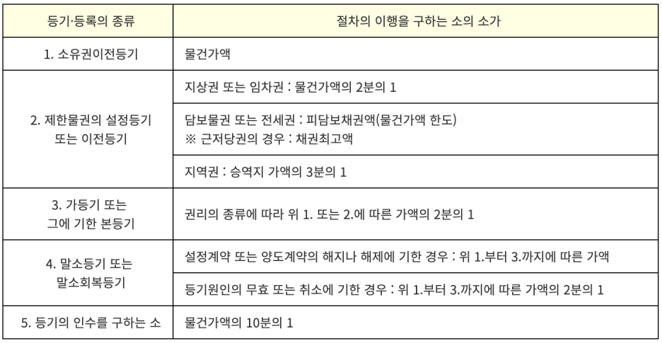 - 등기.등록 등 절차에 관한 소가 산정 방법 (‘민사사송 등 인지규칙’ 제13조)