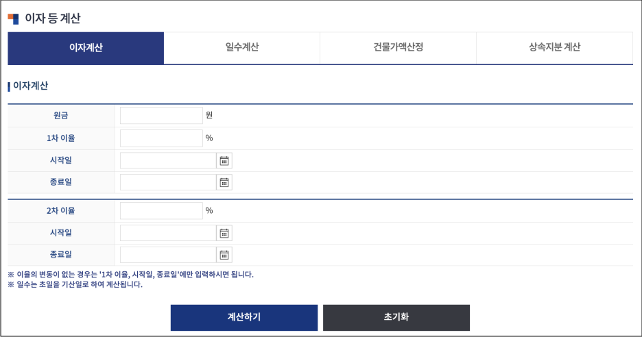 또한, 발생되는 이자, 일수, 건물가액산정, 상속지분 계산 등도 쉽게 확인 할 수 있습니다.