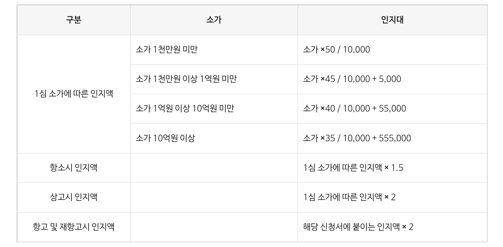 ※ 인지액이 1천원 미만이면 그 인지액은 1천원으로 하고, 1천원 이상이면 100원 미만은 계산하지 않습니다(「민사소송 등 인지법」 제2조제2항).