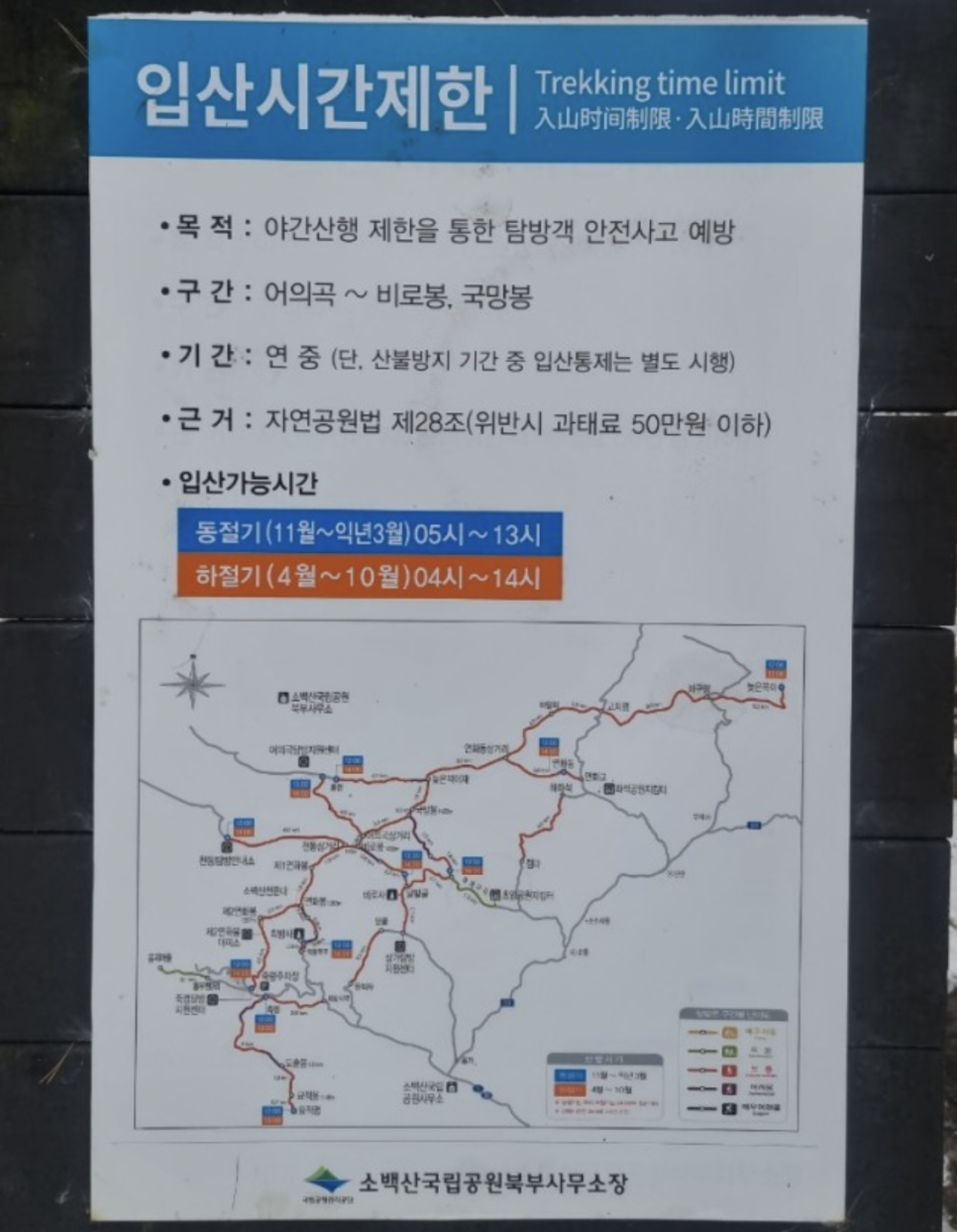 안전을 위해서 입산시간을 제한하고 있네요. 동절기는 13시/하절기는 14시까지 입산 가능합니다. 사전에 시간을 잘 체크하시고 오시기 바랍니다.