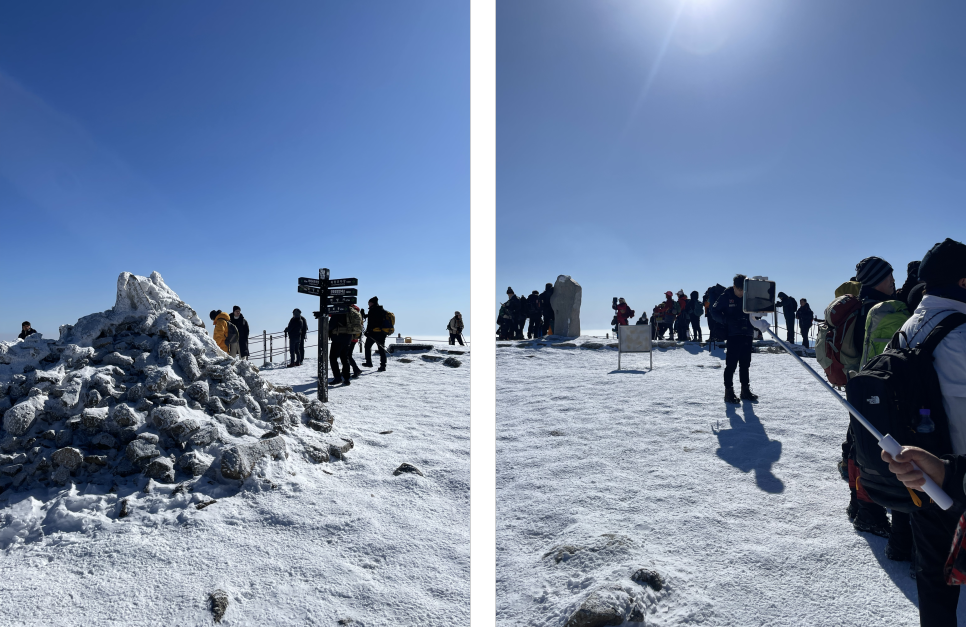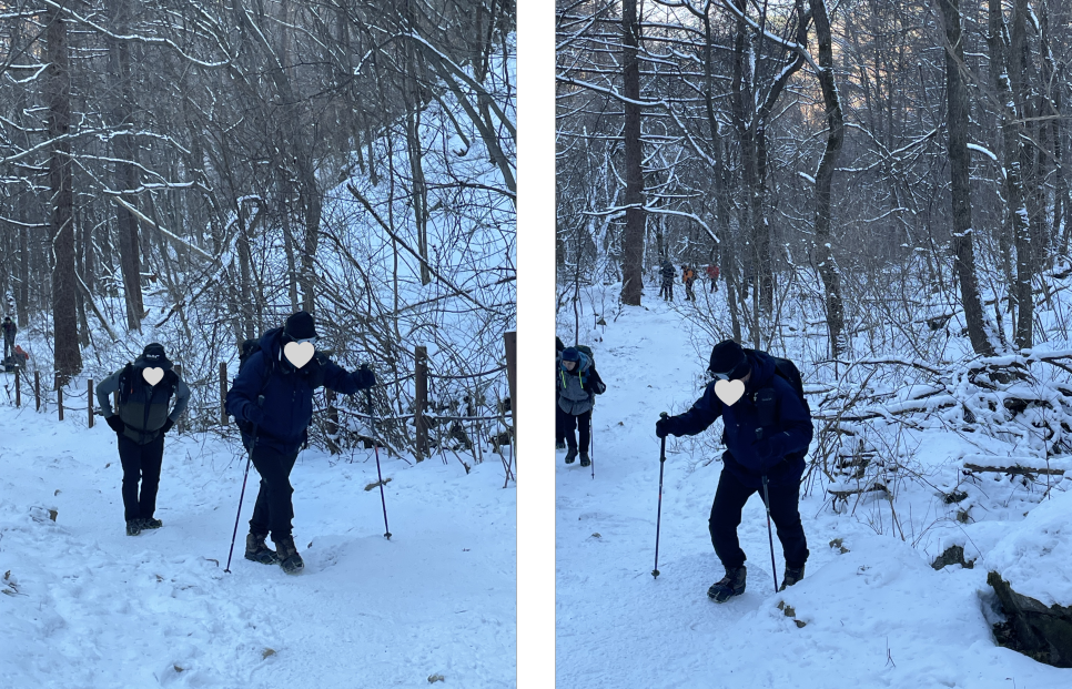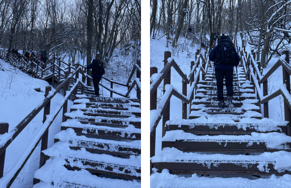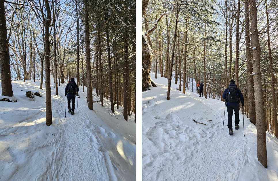 조금 더 올라가니 눈이 쌓여 있는 등반로가 나옵니다. 아이젠을 착용하고 열심히 오르고 있습니다. 오르다보니 다른 등반객들이 보이기 시작하네요.